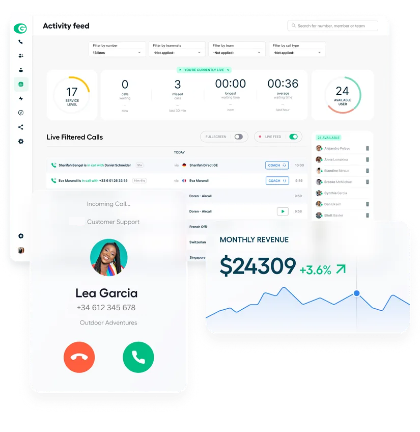 • Keep a close eye on critical KPIs like missed call rate, calls per agent and agent availability, making it easy to ensure you’re reaching your business goals.